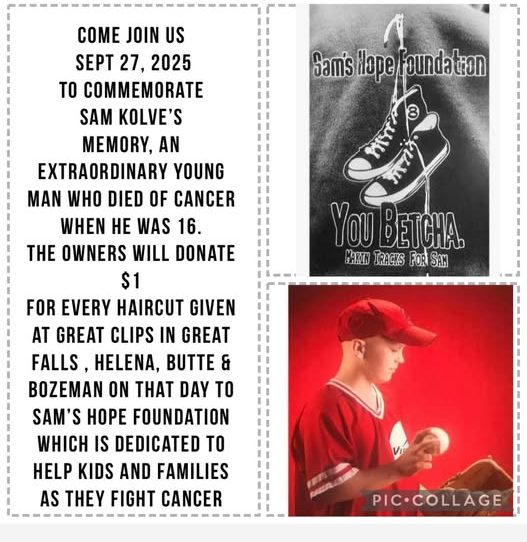 The owners of Great Clips will donate $1 for every haircut given at Great Clips in Great Falls, Helena, Butte and Bozeman on Saturday, September 27th, 2025, to Sam’s Hope Foundation to help kids and families as they fight cancer!